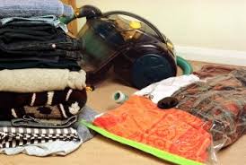 Space Bags- These bags are made of a tough plastic that is folded into a bag with a zipper. The bags also feature a small port where a vacuum hose could be attached and air removed from the bag. This compresses the fibers and flattens the material. The up side is that this means a lot of clothing can be stored in a very small area. The downside is that if the material is held in that position for a long period of time, over a year, the fibers begin to wear and become creased in that position.